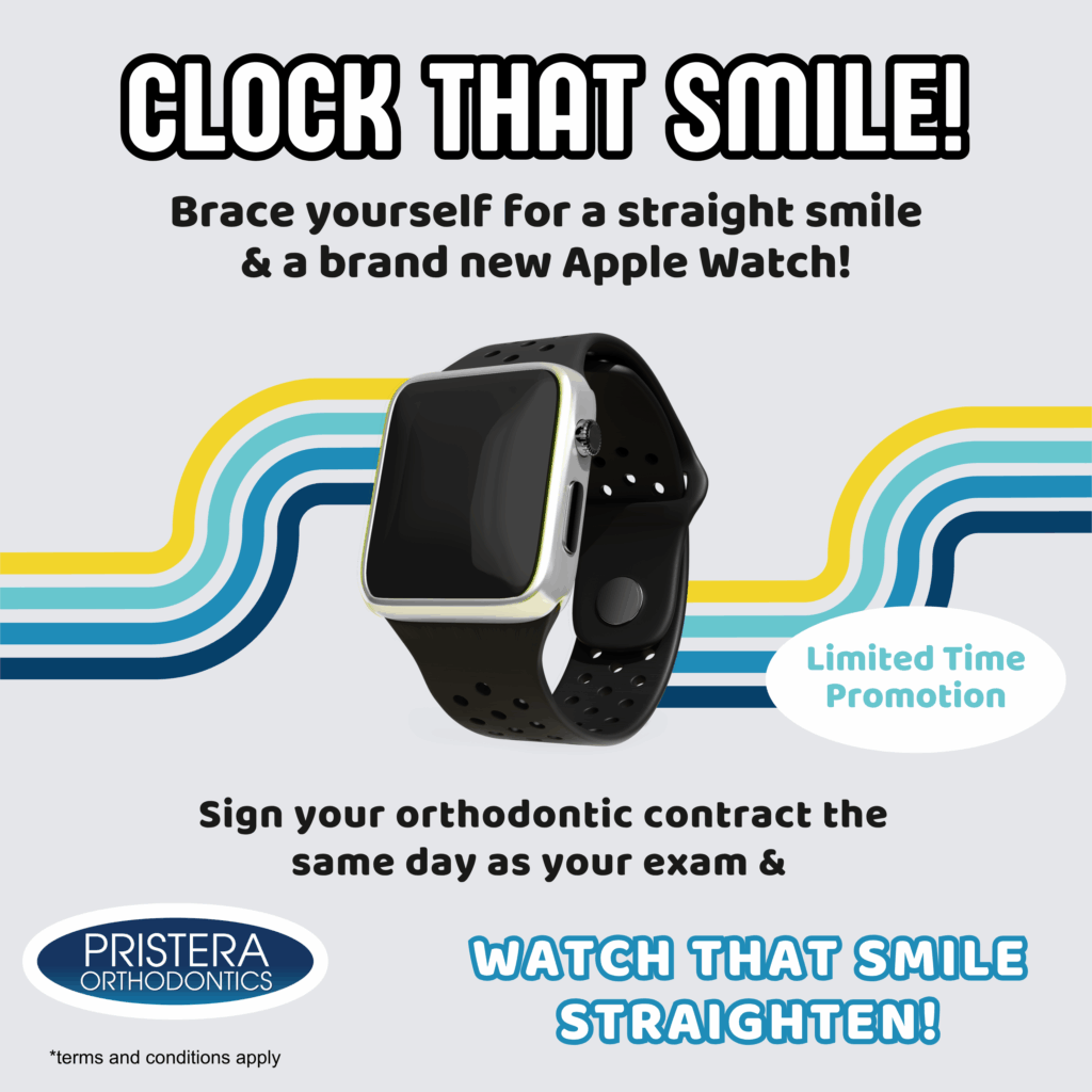 *Offer valid November 1 – December 31, 2025, for new orthodontic patients who sign and make a down payment on the same day as their initial exam. Apple Watch is provided after treatment begins, and the initial payment is received. Early termination or transfer of treatment may result in a charge for the promotional item. No cash value. Cannot be combined with other offers. Please contact our office for a full list of terms and conditions.